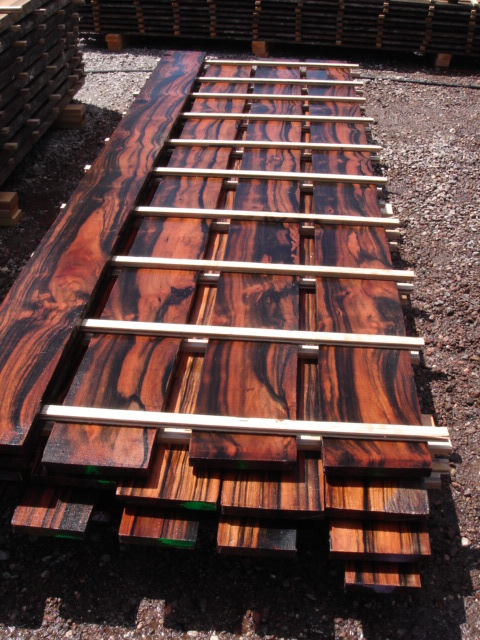 'Mindful attentiveness', at the very least, is required for the proper processing of Macassar Ebony lumber. In Indonesia, the heart-free flitches (cants) are waxed on all 6 faces, and then each cant is individually wrapped in plastic to protect and stabilize the wood on its long journey to our facility in the U.S. Because extremely hard Macassar Ebony has a very low green moisture content, cants can successfully be air-tightly-wrapped for any number of years without concern for heart-rot. Schroeder Hardwoods generally maintains the cants fully wrapped in plastic for 3-8 years before processing. When we finally cut the cants into dimension lumber, we keep all boards from the same respective cant together so that all mirror-matches are retained for use in any final products, from custom furniture to guitars. This extremely patient processing replicates processing of Macassar Ebony trees from days of yore. 50 to 100 years ago the preferred method of aging and stabilizing Macassar Ebony was to 'girdle' the circumference of the base of the Macassar Ebony tree, leave the tree standing to begin drying naturally for 2 years before harvesting the tree, and then finally consolidating it in a given location. In the upper left-hand corner of this page you will see the image of Bubba the Ebony Tagger. After carefully inspecting both ends of each cant, he color-codes at least one end from each cant with a 'V' of differing colors, so that all boards from that respective cant can be stickered and kept together during and after slow drying. The 'V' is painted by Bubba to indicate the re-sawing orientation to yield the maximum quarter-sawn faces. We prefer very slow air-drying-only here in the crisp air of the high desert. The U.S. Forest Products Lab data indicate that wood, hard or soft, air-dried-only versus kiln-dried, results in wood after drying that has 40% greater Modulus of Rupture (harder) and 15% greater Modulus of Elasticity (the capacity of wood to expand and contract without cracking). This latter quality is critically important in the stability of all finished wooden products. Thus, with our Macassar Ebony, the wood is aged at least 7 years between time of harvest and time that lumber is slowly air-dried-only and ready for market. We "hasten slowly", in the words of Caesar Augustus. The photos on this page illustrate custom-cutting with a precision mill, our workers washing thoroughly each board fresh off the saw, stickering the matched boards from each respective cant, then carefully stacking in our warehouse to slowly air-dry-only for at least 4 years. A laborious and time-consuming method for Schroeder Hardwoods to correctly bring Macassar Ebony lumber to market. 'Old School' Macassar Ebony from Schroeder Hardwoods. _________________________________________ Sign Up For Our Macassar Ebony Newsletter Kurt's Phone: |